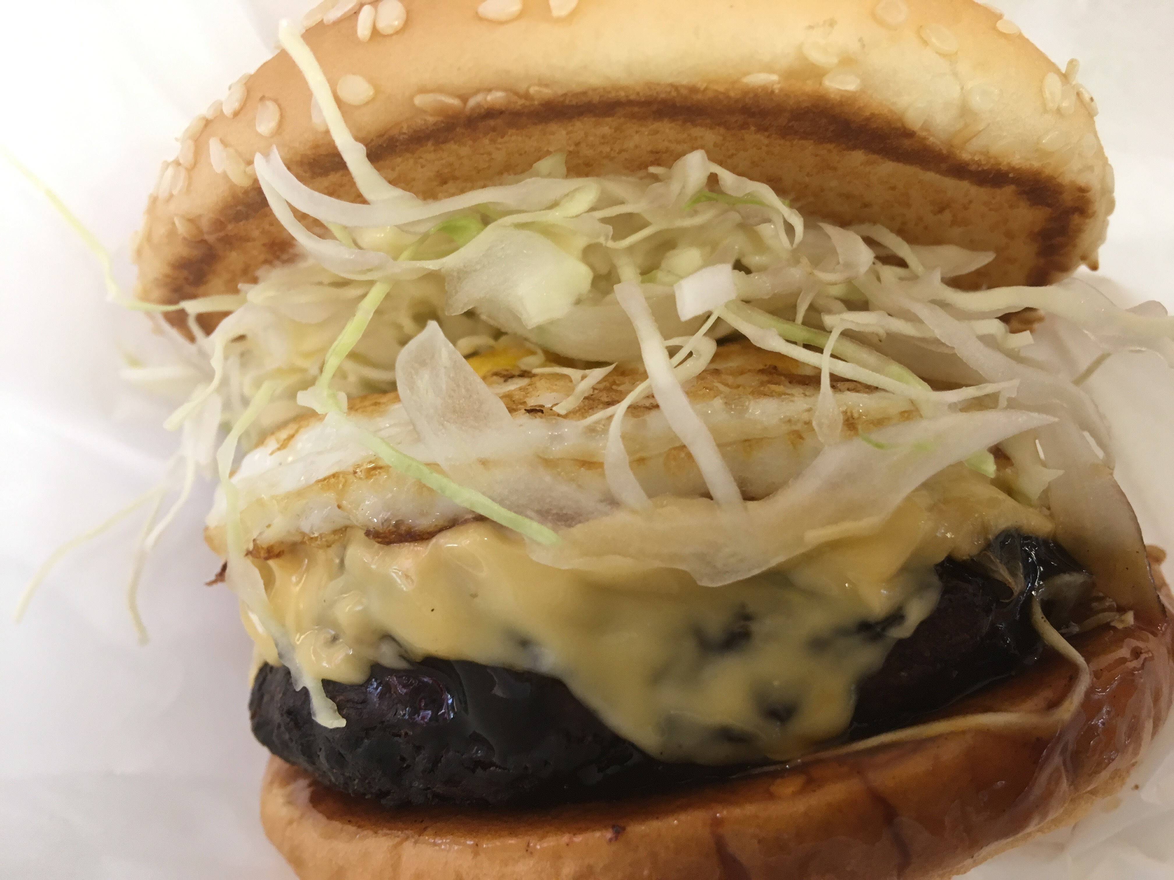 日本初のハンバーガーチェーンと言えば、1970年創業のご存じドムドムハンバーガーです。そしてそのドムドムにあって昨年18年ぶりに復活した幻のメニューと言えば、そう、言わずと知れたお好み焼きバーガーです。バンズに目玉焼きとたっぷりのキャベツと甘いソースをたっぷり塗りたくったお好み焼きのパティをはさんだその威容、ぱっと見た目はお好み焼きのパティが黒っぽいので普通のハンバーガーにも見えますが、実際にむさぼりついてみるとお好み焼きソースの甘みが口の中に広がるも、それでいて失わないハンバーガーとしての一体感。18年ぶりに食べましたが、美味しい…( ^)p(^ )。