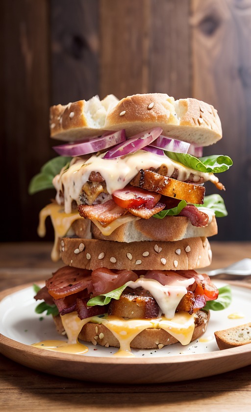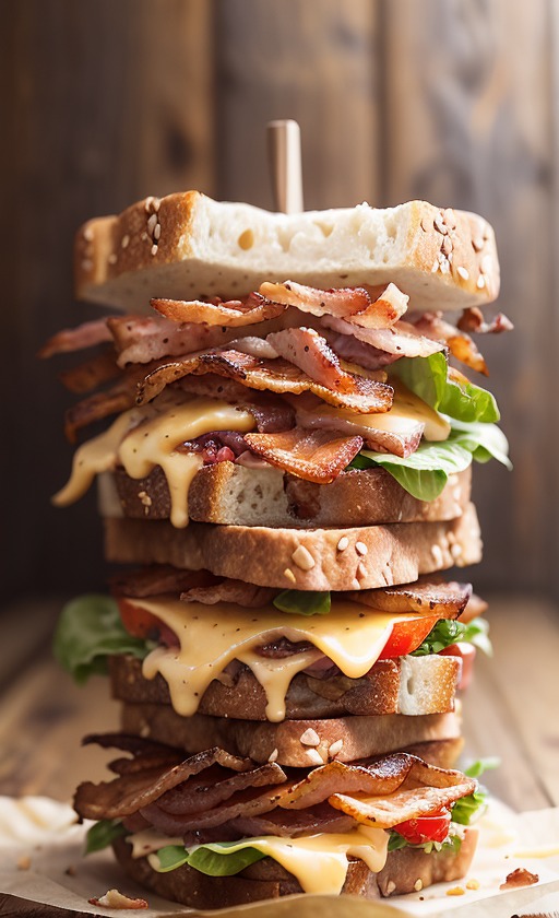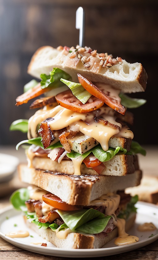 Real Worldでは決して口に出来ない豪勢なサンドイッチ画像を生成して一人で布団の話の兄弟ごっこ@ラフカディオ・ハーンをしていると、さらにお腹が空いてくる生の不可思議さよ…(´;ω;`)ウッ…。これもうディストピアごっこじゃなくてディストピアだな。