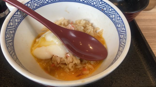 I decided to eat the soft-boiled egg in a small bowl over the remaining rice. Spoons can be borrowed freely.