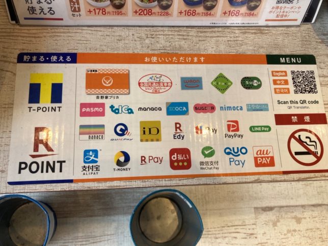 提前看菜單決定想吃什麼似乎更好。 本來打算點牛蓋飯(牛丼)的,但是還沒到上午11:00,就點了工作人員推薦的牛肉早餐套餐。 我打算用信用卡/借記卡付款,但令我驚訝的是,我被告知我不能用這些卡付款。 現金以外的支付方法如下。