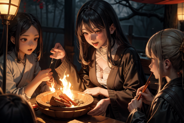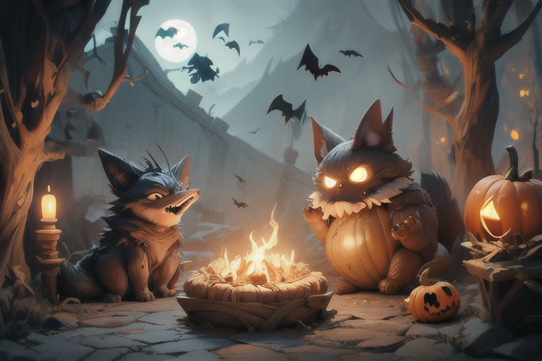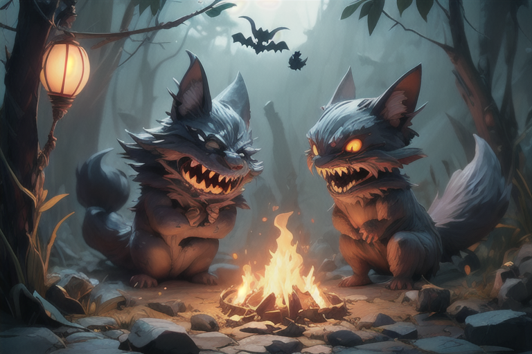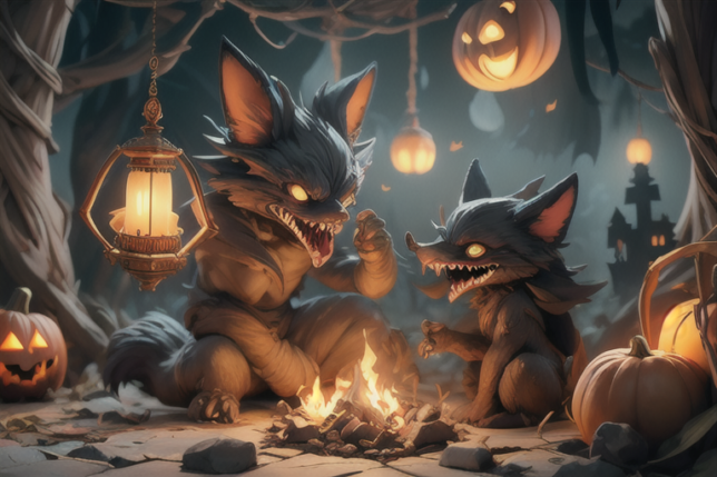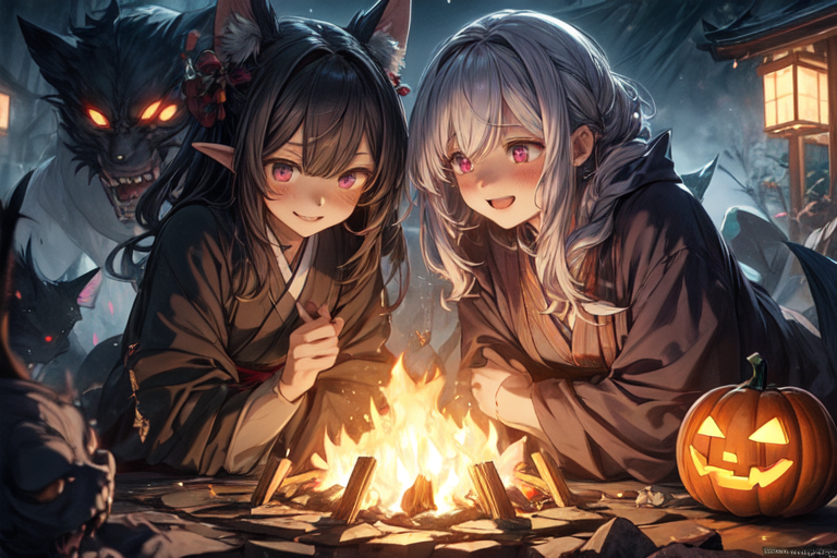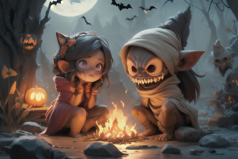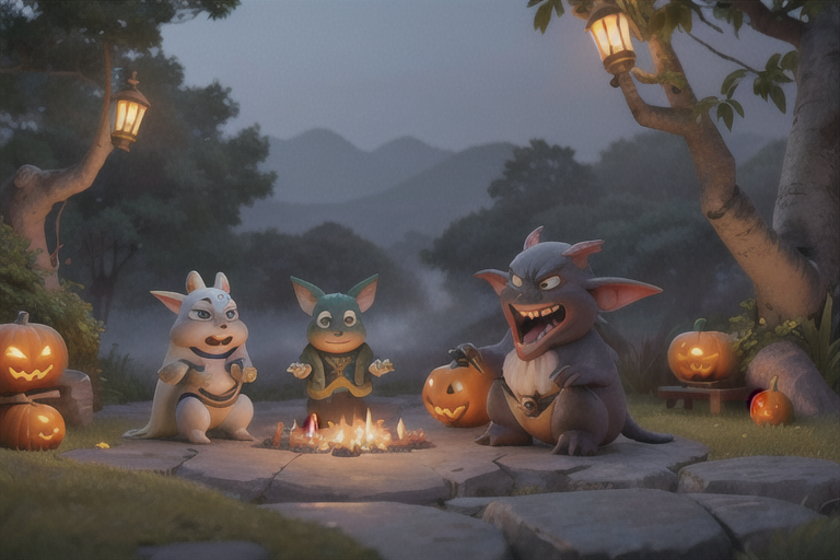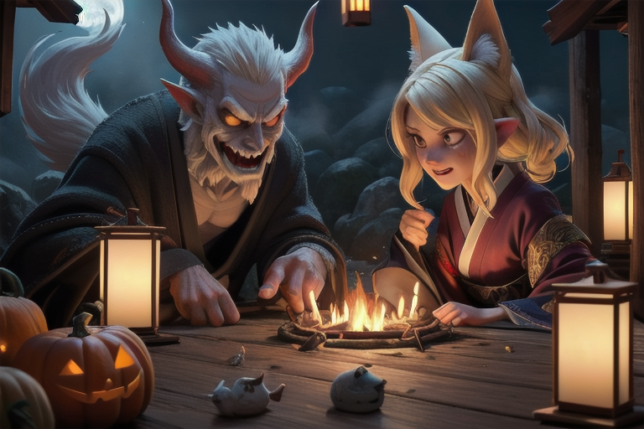 As Halloween night deepened, the spirits and monsters found themselves in a sacred bamboo grove, illuminated by the soft glow of lanterns. Around a mystical bonfire, they shared stories of their worlds, their struggles, and dreams. It was in this vulnerable exchange that they realized how similar they were, despite their apparent differences.