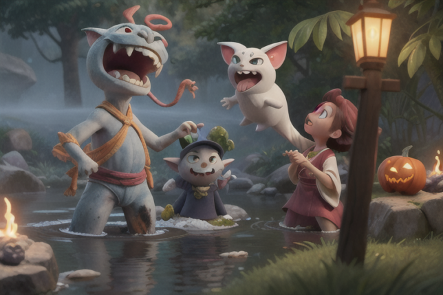 Kappa, the water-dwelling creatures, exchanged riddles with cheeky goblins, while kitsune, the shape-shifting foxes, shared tales of ancient magic with friendly ghosts. Together, they embarked on a grand adventure, exploring Japan’s mystical forests, serene temples, and bustling cities.